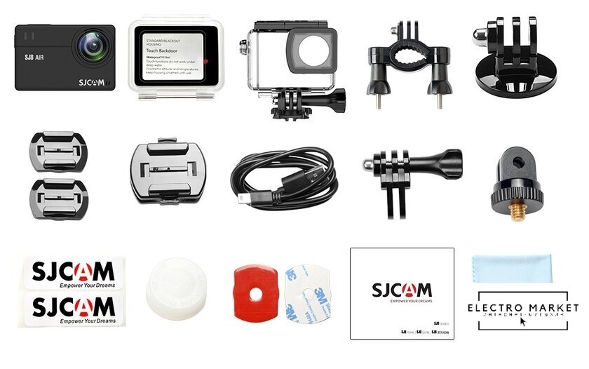 Комплект поставки | Водонепроницаемый чехолБыстросъемная площадкаКрепление для площадкиИзогнутый клейкий крепежРовный клейкий крепеж3м клейкой ленты1/4" головаАдаптер для штативаТряпкаЗарядный кабельДокументация |