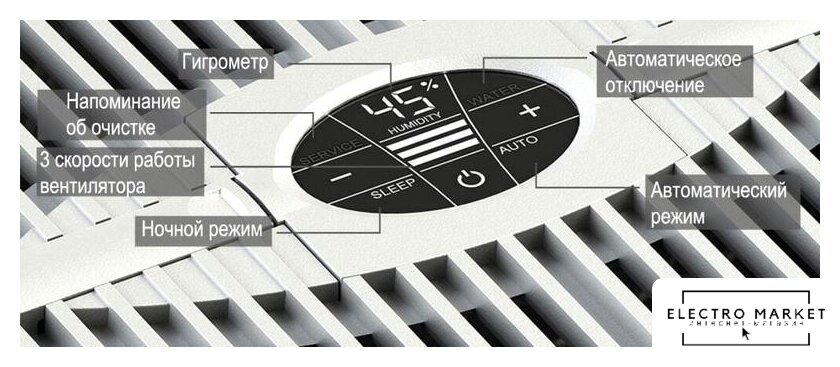 Индикация | влажности, замены фильтров, отсутствия воды, скорости работы вентилятора |