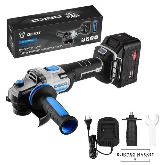 Комплект поставки | - Углошлифовальная машина - 1 шт.- Аккумулятор 6,0 Ач - 1 шт.- Зарядное устройство - 1 шт.- Защитный кожух - 1 шт.- Дополнительная рукоятка - 2 шт.- Фланцевый ключ - 1 шт.- Инструкция- Коробка |