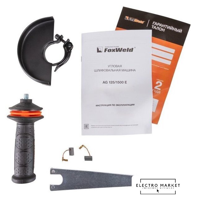 | Комплект поставки | • Угловая шлифовальная машина AG 125/1500 E – 1 шт.;• Быстрозажимной защитный кожух – 1 шт.;• Ключ – 1 шт.;• Комплект из двух угольных щёток – 1 шт.;• Антивибрационная боковая рукоятка – 1 шт.;• Инструкция + Гарантийный талон – 1 компл. |