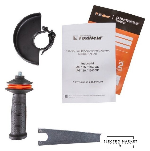 | Комплект поставки | • Угловая шлифовальная машина бесщеточная Industrial AG 125/1600 ХE – 1 шт.;• Быстрозажимной защитный кожух – 1 шт.;• Ключ – 1 шт.;• Антивибрационная боковая рукоятка – 1 шт.;• Инструкция + Гарантийный талон – 1 компл. |