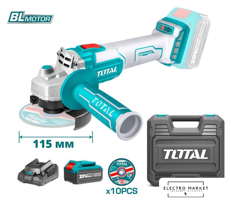 Комплект поставки | Угловая шлифмашина - 1 шт.Боковая рукоятка - 1 шт.Фланцевый ключ - 1 шт.Аккумулятор TFBLI2002 4,0 Ач - 1 шт.Зарядное устройство TFCLI2001E - 1 шт.Отрезной диск - 10 шт.ИнструкцияКейс |