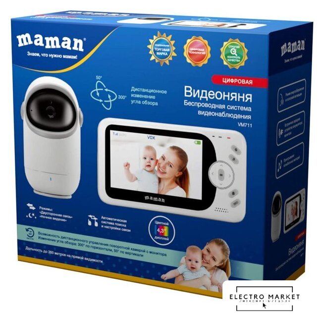 видеоняня цифровая, обратная связь, размер: 3.1 '', индикация: заряд аккумулятора/выход из радиуса действия/температура, музыка