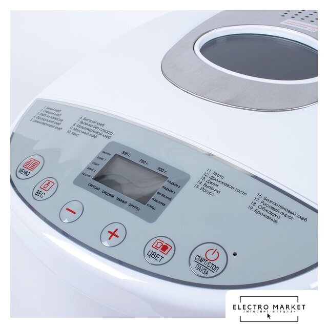 | Основные программы | французский багет, безглютеновая выпечка, кекс, сладкая выпечка, варенье, йогурт, белый хлеб, замес теста, цельнозерновой хлеб |