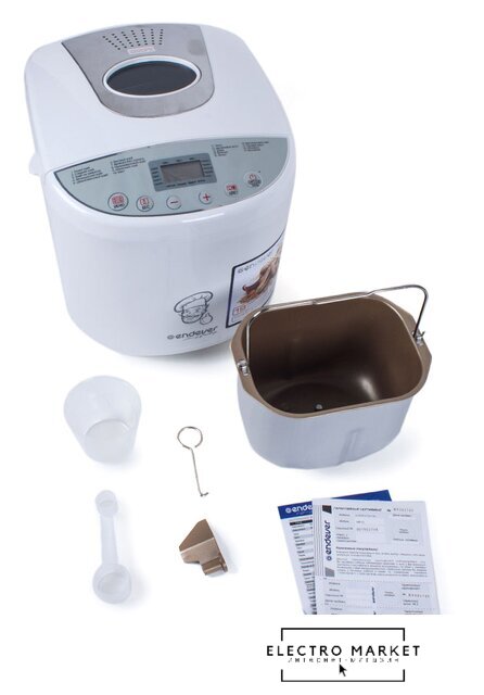 | Комплект поставки | Антипригарная ёмкость для выпечки Мерный стакан Мерная ложка Лопасть для замешивания теста Крюк для извлечения лопасти Руководство по эксплуатации |