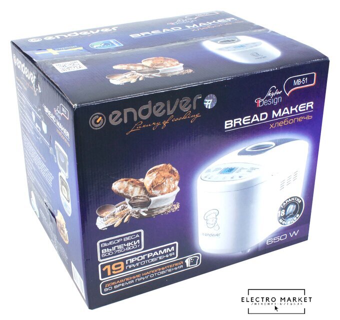 550 Вт, вес выпечки: 750 г, регулировка веса выпечки, 19 программ выпечки, выбор цвета корочки, замес теста