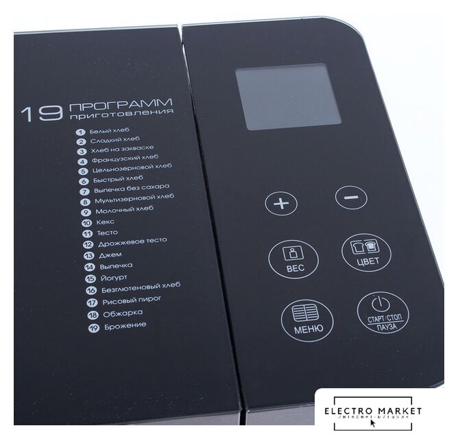 550 Вт, вес выпечки: 1000 г, регулировка веса выпечки, 19 программ выпечки, выбор цвета корочки, замес теста
