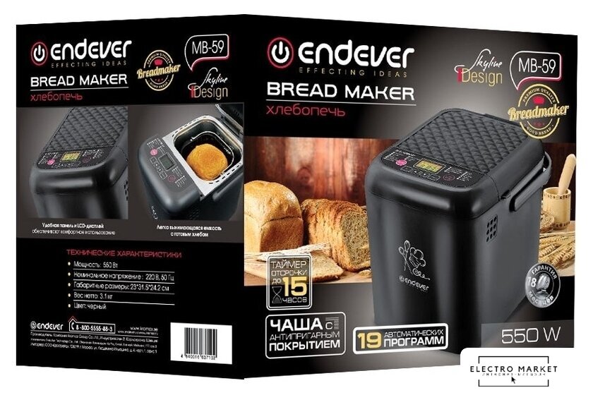 550 Вт, вес выпечки: 1000 г, регулировка веса выпечки, 19 программ выпечки, выбор цвета корочки, замес теста