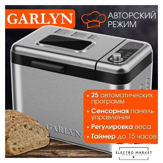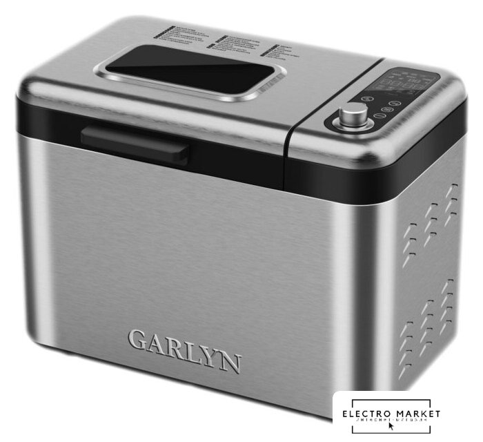 | Перечень режимов работы | 1. Белый хлеб2. Французский хлеб3. Цельнозерновой хлеб4. Сдоба5. Безглютеновый хлеб6. Хлеб быстрой выпечки7. Кекс8. Бородинский хлеб9. Хлеб с добавками10. Итальянский хлеб11. Ржаной хлеб12. Хлеб для сэндвичей13. Диетический хлеб14. Замес с изменением времени15. Дрожжевое тесто16. Расстойка и выпечка17. Бисквит18. Десерт19. Суп20. Тушение21. Варка22. Молочная каша23. Джем24. Йогурт25. GARLYN ШЕФ |