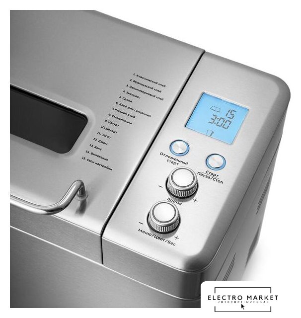 | Основные программы | безглютеновая выпечка, белый хлеб, варенье, десертная выпечка, йогурт, кекс, пшеничный хлеб, ржаной хлеб, сладкая выпечка, французский хлеб, цельнозерновой хлеб, экспресс |