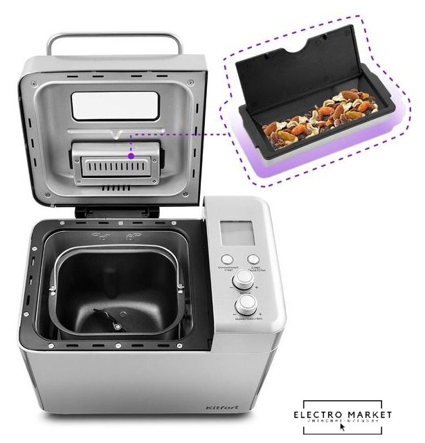 710 Вт, вес выпечки: 900 г, регулировка веса выпечки, 19 программ выпечки, замес теста, диспенсер