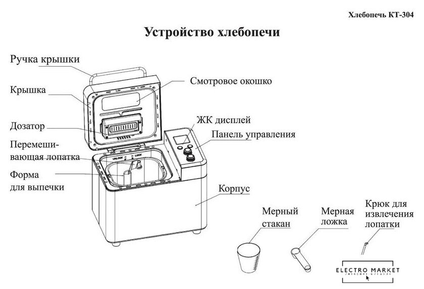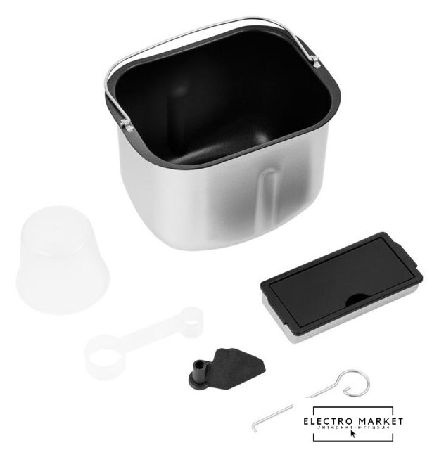 | Комплект поставки | Хлебопечь;Форма для выпечки с антипригарным покрытием;Перемешивающая лопатка;Дозатор;Мерный стакан;Мерная ложка;Крюк для извлечения лопатки;Руководство по эксплуатации;Гарантийный талон. |