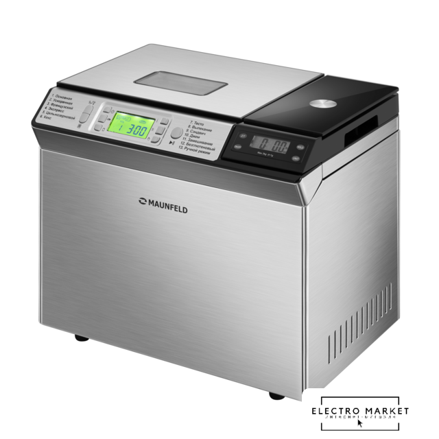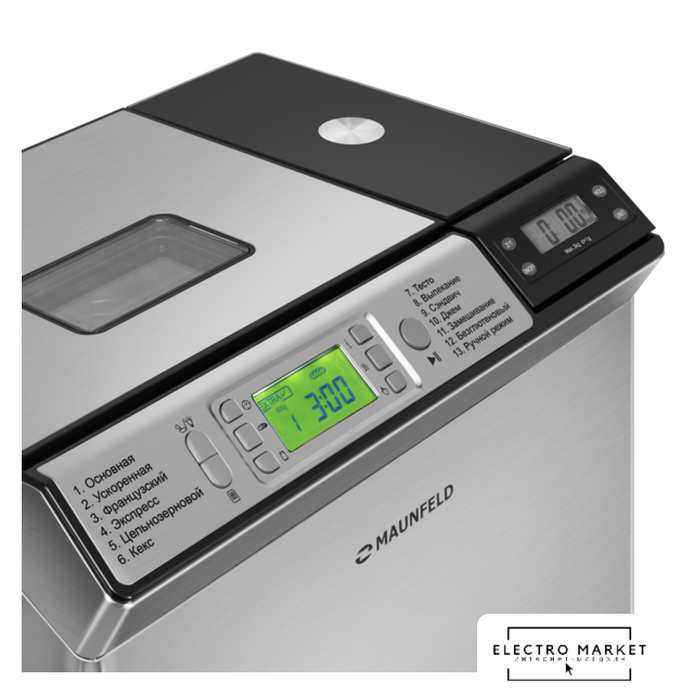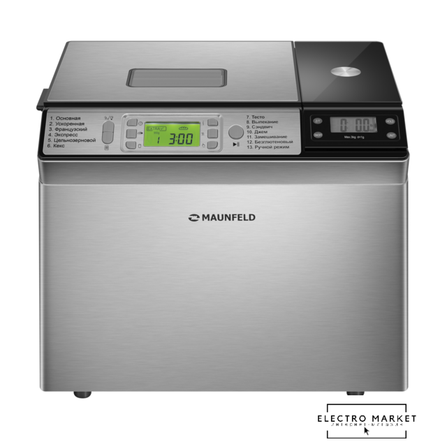 | Перечень режимов работы | 1. Основная2. Ускоренная3. Французский4. Экспресс5. Цельнозерновой6. Кекс7. Тесто8. Выпекание9. Сэндвич10. Джем11. Замешивание12. Безглютеновый13. Ручной режим |