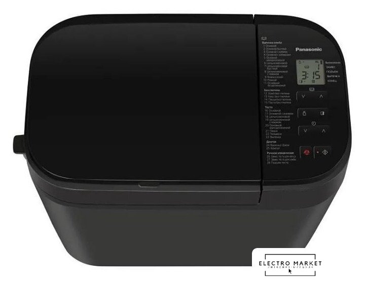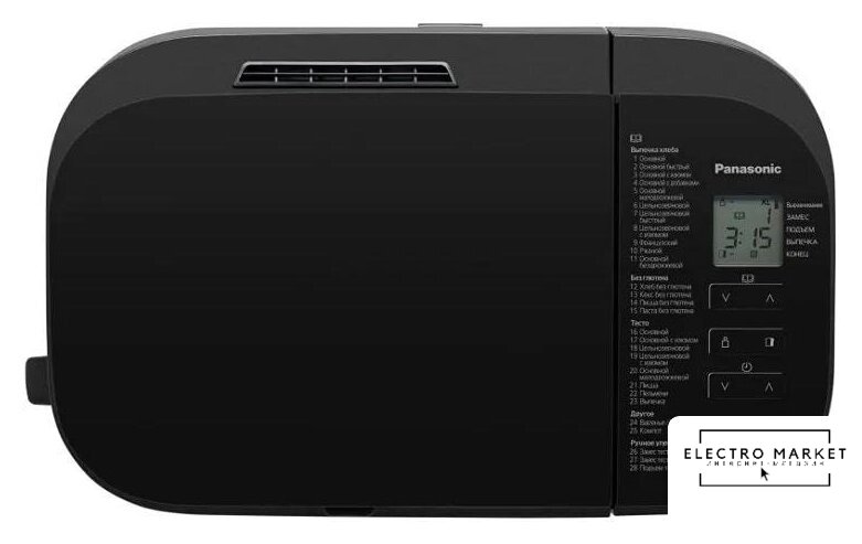 Перечень режимов работы | Авто меню (Хлеб):1. Основной2. Основной быстрый3. Основной с изюмом4. Основной с добавками5. Основной малодрожжевой6. Цельнозерновой7. Цельнозерновой быстрый8. Цельнозерновой с изюмом9. Французский10. Ржаной11. Основной бездрожжевойАвто меню (Без глютена):12. Хлеб без глютена13. Кекс без глютена14. Пицца без глютена15. Паста без глютенаАвто меню (Тесто):16. Основной17. Основной с изюмом18. Цельнозерновой19. Цельнозерновой с изюмом20. Основной малодрожжевой21. Пицца22. Пельмени23. ВыпечкаАвто меню (Другое):24. Варенье/Джем25. КомпотАвто меню (Ручное управление):26. Замес теста для кекса27. Замес теста для хлеба28. Подъем теста |