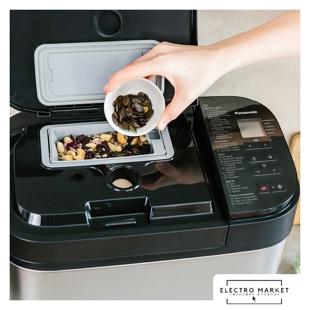 вес выпечки: 1100 г, регулировка веса выпечки, 28 программ выпечки, выбор цвета корочки, замес теста, диспенсер