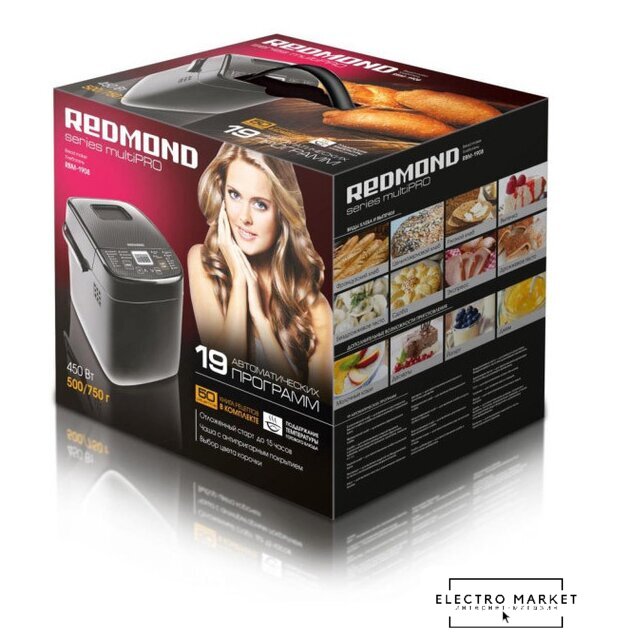 850 Вт, вес выпечки: 1250 г, регулировка веса выпечки, 12 программ выпечки, выбор цвета корочки, замес теста
