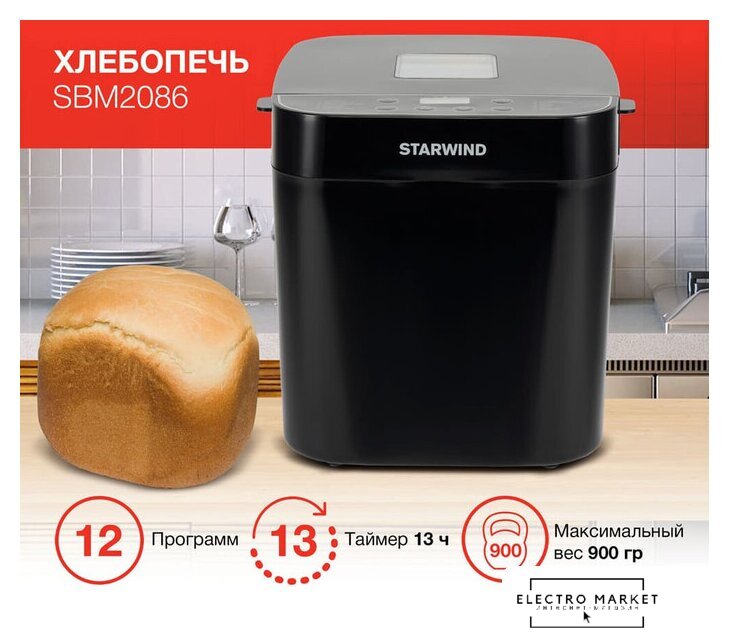 550 Вт, вес выпечки: 900 г, регулировка веса выпечки, 13 программ выпечки, выбор цвета корочки, замес теста
