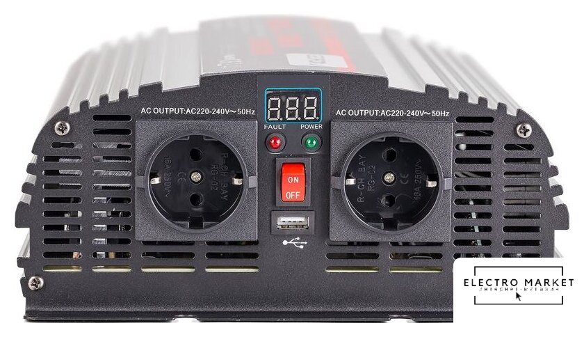 вход: 24 В, выход: 220 В, КПД: 92%, защита от короткого замыкания, от перегрузки, от перегрева, от низкого входного напряжения