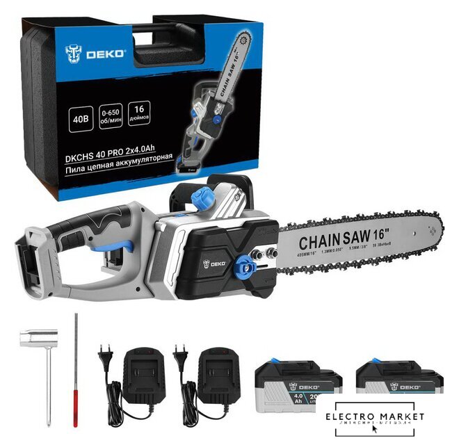 Комплект поставки | Пила цепная (основной корпус) - 1 шт.Шина - 1 шт.Пильная цепь - 1 шт.Защитный щиток - 1 шт.Защитный чехол цепи и шины - 1 шт.Зарядное устройство - 2 шт.Аккумулятор (4 А/ч, 20 В) - 2 шт.Торцевой ключ - 1 шт.Напильник для заточки цепи - 1 шт.Руководство по эксплуатации - 1 шт.Кейс |