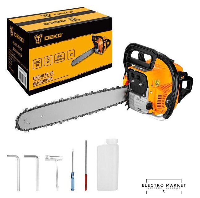 Комплект поставки | - Бензопила в частично разобранном виде (корпус двигателя – 1шт, шина – 1шт, цепь – 1шт, защитный щиток – 1шт, упор зубчатый (гребенка) – 1шт, саморезы – 2шт) - 1 шт.- Ключ свечи зажигания - 1 шт.- Отвертка для регулировки карбюратора - 1 шт.- Шестигранные ключи - 2 шт.- Напильник - 1 шт.- Емкость для приготовления топливной смеси - 1 шт.- Руководство по эксплуатации - 1 шт. |