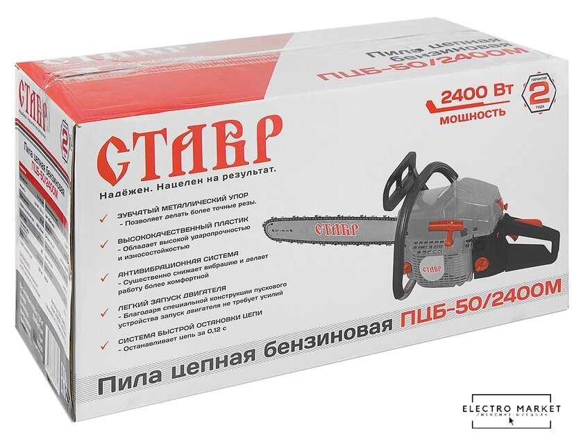 бензиновая, полупрофессиональная, 2.3 кВт, шаг цепи: 3/8 дюйма, длина шины: 50 см, легкий пуск, 6.2 кг