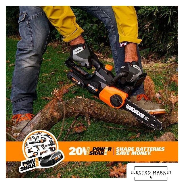 аккумуляторная, бытовая, 20 В, шаг цепи: 3/8 дюйма, длина шины: 30.5 см, аккумулятор в комплекте, быстрое натяжение цепи, 5.7 кг