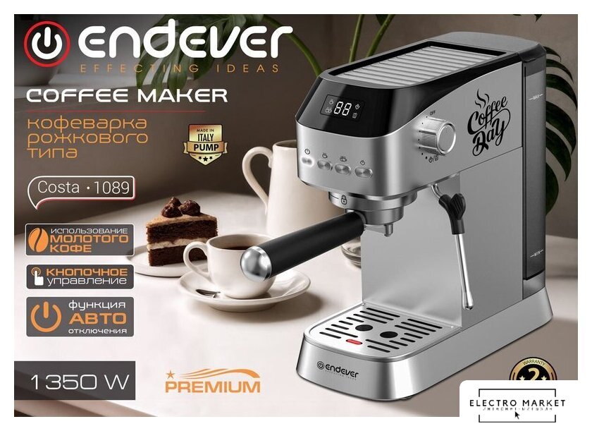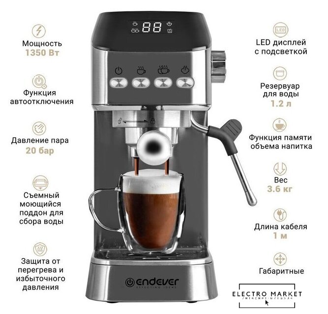 1350 Вт, корпус металл/пластик, капучинатор автоматический, используемый кофе: молотый, цвет нержавеющая сталь