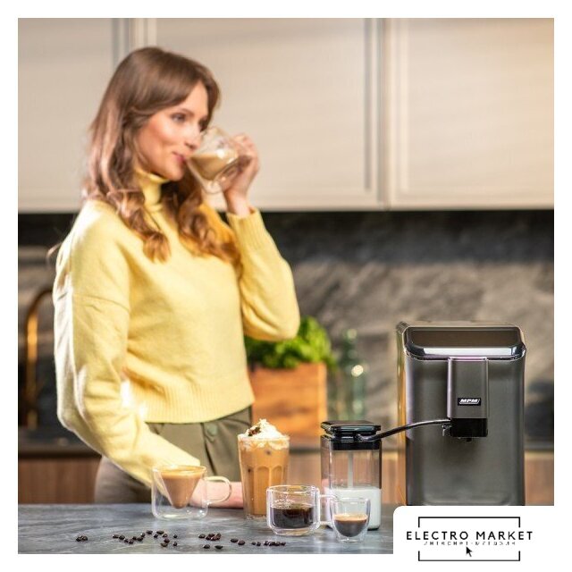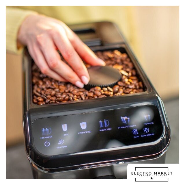 кофемашина, 1450 Вт, корпус пластик, капучинатор автоматический, используемый кофе: молотый/зерновой, цвет нержавеющая сталь/черный