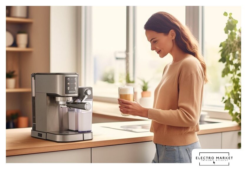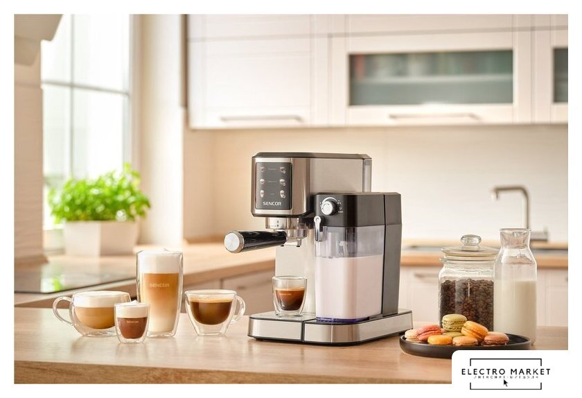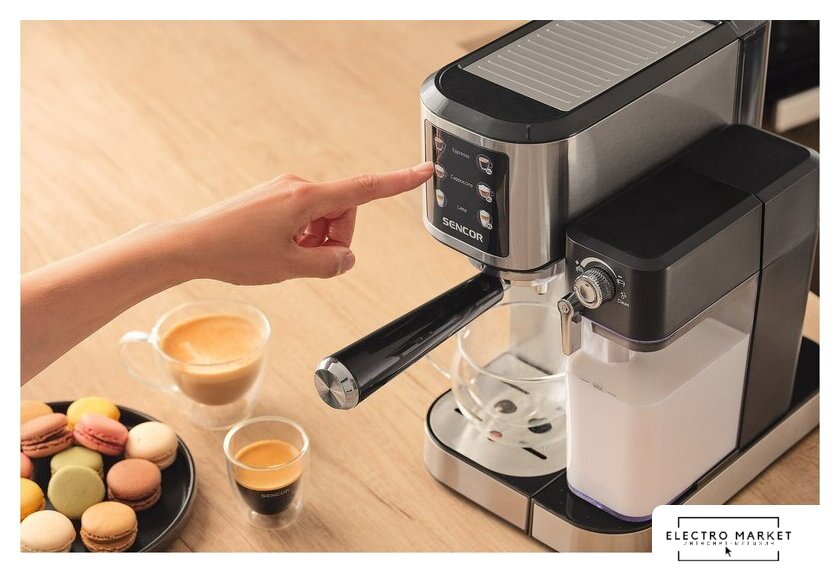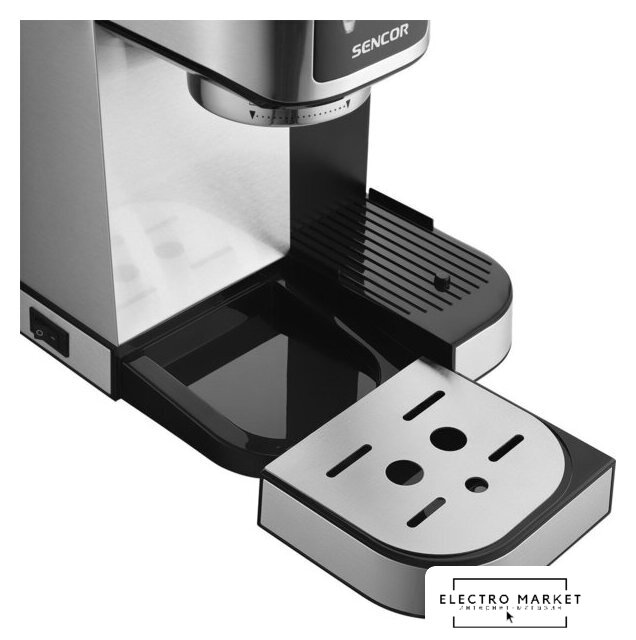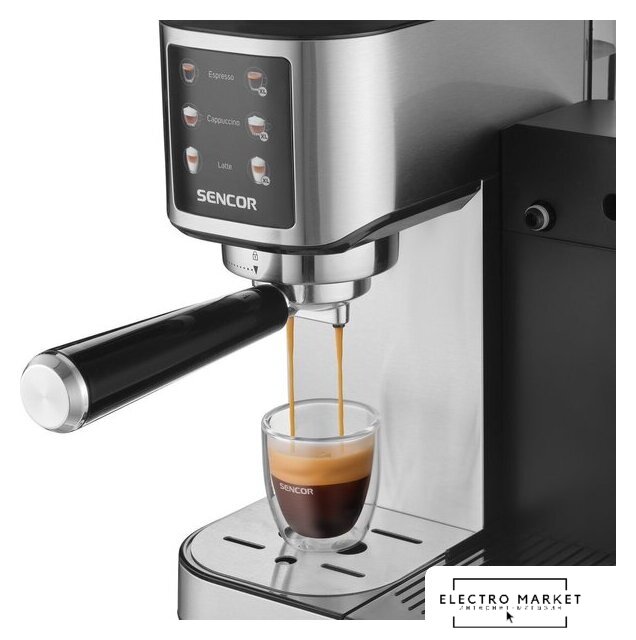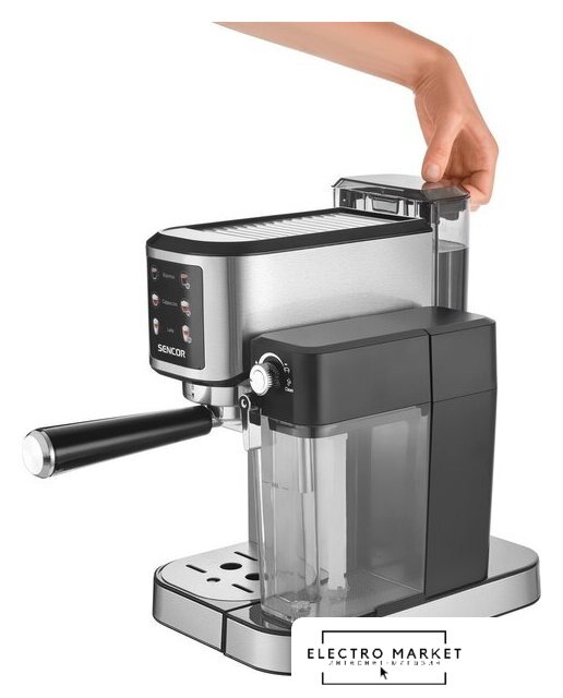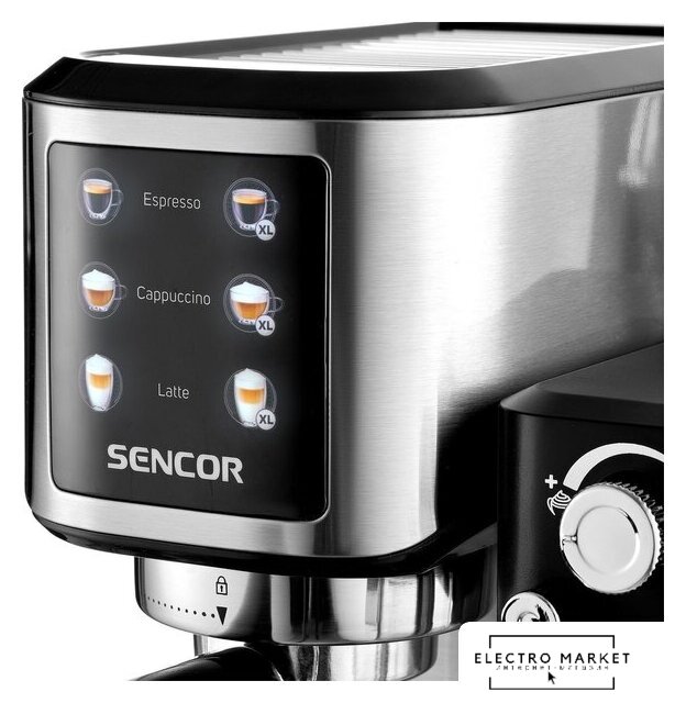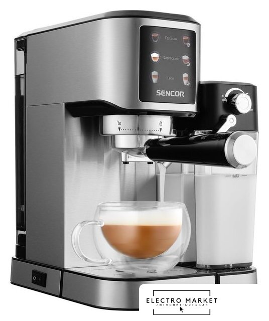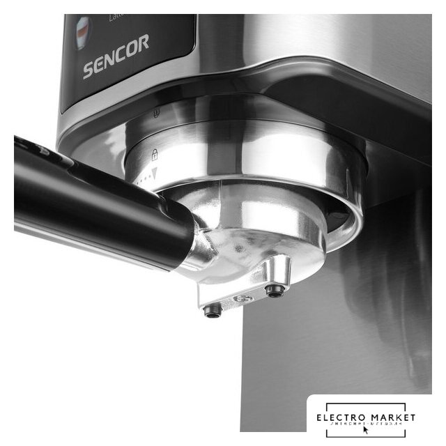рожковая помповая кофеварка, 1470 Вт, корпус металл/пластик, капучинатор автоматический, используемый кофе: молотый, цвет нержавеющая сталь/черный