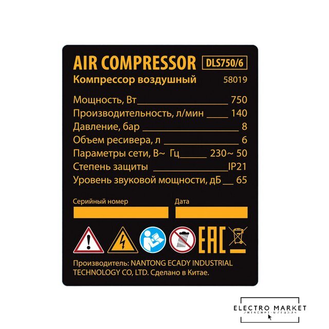 | Комплектация | - Компрессор воздушный - 1 шт, - руководство по эксплуатации;- гарантийный талон - 1 шт |