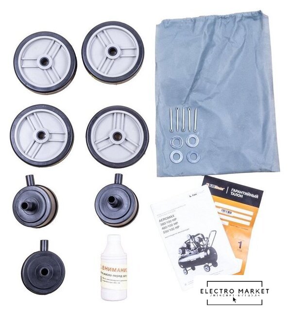 | Комплектация | - Компрессор- Колеса с комплектом для крепления - 4 шт.- Сапун масляного картера - 1 шт.- Воздушный фильтр - 3 шт.- U-образная ручка с комплектом для крепления ручки - 1 шт.- Масло компрессорное VDL 100 в бутылке - 1шт.- Инструкция по эксплуатации + Гарантийный талон |