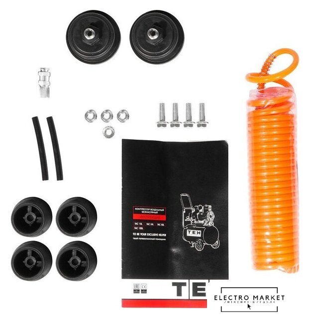 | Комплектация | - Компрессор;, - Фильтр воздушный - 2 шт.;, - Опора резиновая - 4 шт.;, - Набор крепежный - 1 компл.;, - Шланг спиральный;, - Руководство по эксплуатации;, - Упаковка (картонная коробка). |
