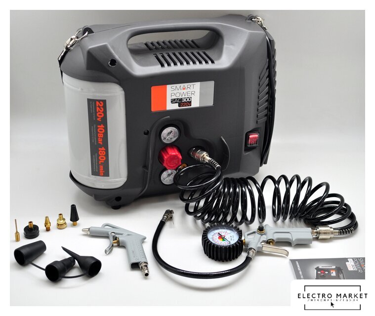| Комплект поставки | - Воздушный компрессор SAC-300 - 1 шт.- Пневмошланг с разъёмами - 1 шт.- Пневмопистолет с манометром - 1 шт.- Продувочный пистолет - 1 шт.- Ремень для переноски - 1 шт.- Дополнительные насадки для накачки - 7 шт.- Руководство по эксплуатации- Гарантийный талон- Упаковочная коробка |