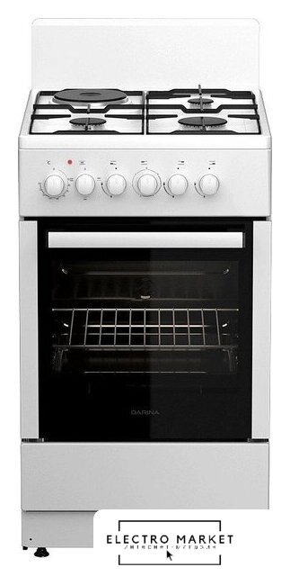 газ + электро панель + электрический духовой шкаф, газ-контроль конфорок, поверхность: эмалированная сталь, энергопотребление A, управление механическое, без таймера, размеры (ШхГхВ): 50x60x85 см, цвет белый