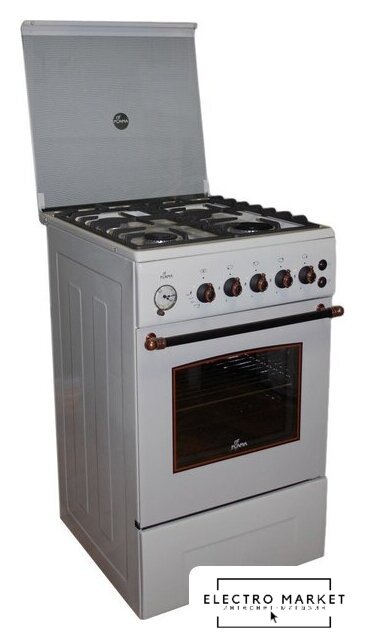 газовая панель + электрический духовой шкаф, газ-контроль конфорок, поверхность: эмалированная сталь, крышка из закалённого стекла, энергопотребление A, управление механическое, таймер механический, размеры (ШхГхВ): 60x60x85 см, цвет белый/серый