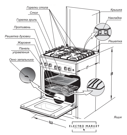 газовая панель + газовый духовой шкаф, газ-контроль конфорок, поверхность: эмалированная сталь, крышка из эмалированной стали, управление механическое, без таймера, размеры (ШхГхВ): 60x60x85 см, цвет коричневый