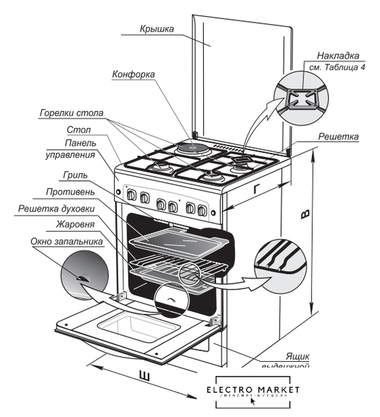 газовая панель + газовый духовой шкаф, газ-контроль конфорок, поверхность: эмалированная сталь, крышка из эмалированной стали, управление механическое, без таймера, размеры (ШхГхВ): 50x57x85 см, цвет коричневый