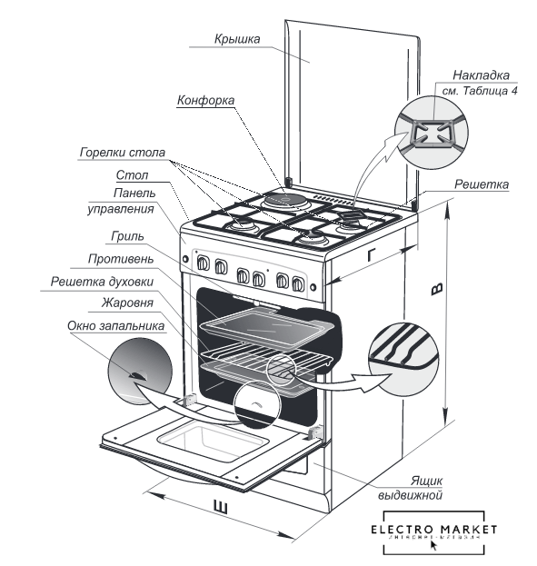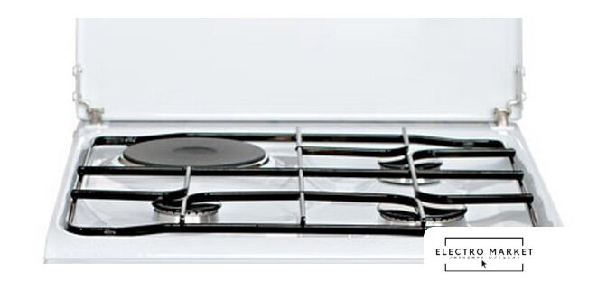 газ+электро панель + газовый духовой шкаф, поверхность: эмалированная сталь, крышка из эмалированной стали, управление механическое, без таймера, размеры (ШхГхВ): 60x60x85 см