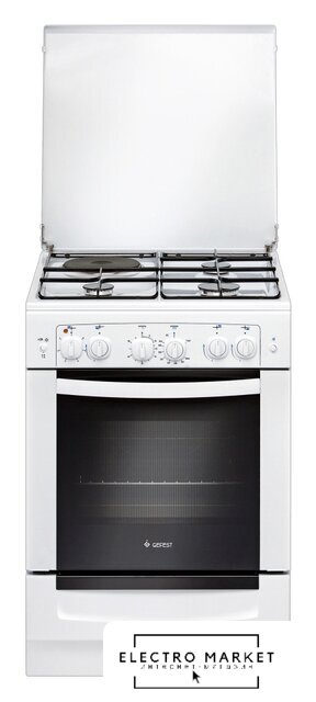газ+электро панель + электрический духовой шкаф, поверхность: эмалированная сталь, крышка из закалённого стекла, управление механическое, без таймера, размеры (ШхГхВ): 50x60x85 см