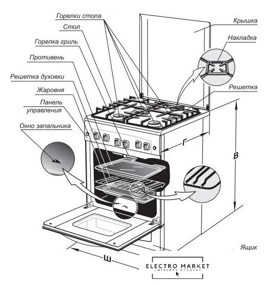 газовая панель + газовый духовой шкаф, поверхность: нержавеющая сталь, крышка из закалённого стекла, управление механическое, таймер механический, размеры (ШхГхВ): 60x60x85 см, цвет нержавеющая сталь