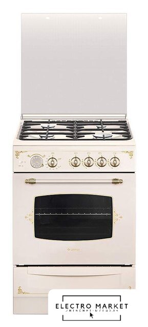 газовая панель + электрический духовой шкаф, поверхность: эмалированная сталь, крышка из закалённого стекла, управление механическое, без таймера, размеры (ШхГхВ): 50x60x85 см