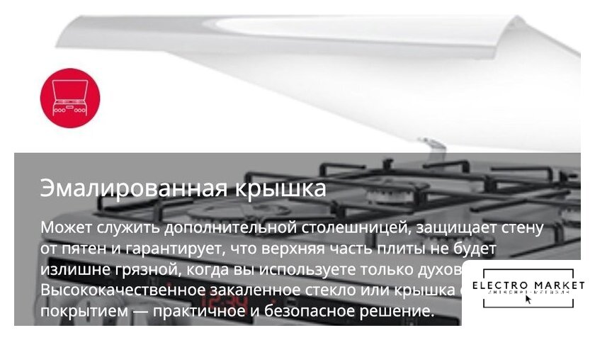 газовая панель + электрический духовой шкаф, газ-контроль конфорок, поверхность: эмалированная сталь, крышка из эмалированной стали, управление механическое, таймер электронный, размеры (ШхГхВ): 50x58.5x85 см, цвет белый