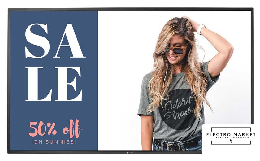 65" 3840x2160, сенсорный, матрица VA, яркость 350 кд/м2, контраст 4000:1, BT, Wi-Fi,USB