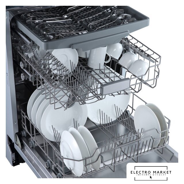 загрузка на 11 комплектов посуды, электронное управление, 7 программ, 44.8x55.8x82 см, серый цвет, сушка: стандартная (конденсация), индикация на полу: луч