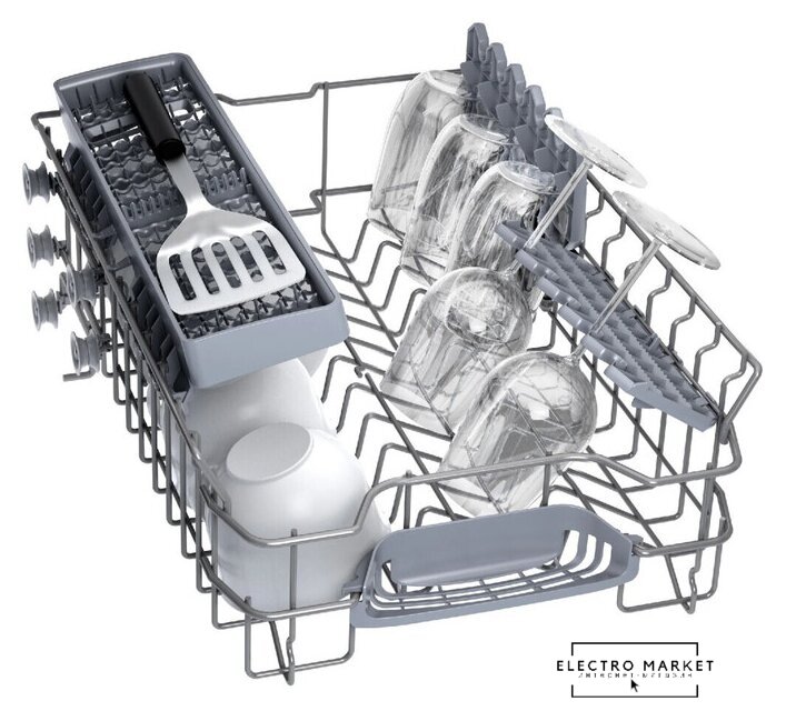 | Особенности верхней корзины | регулировка положения по высоте, резиновые держатели для бокалов, складывающиеся держатели |