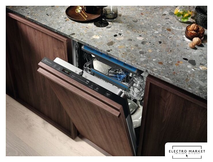 загрузка на 10 комплектов посуды, сенсорное управление, 8 программ, 44.6x55x82 см, черный цвет, сушка: стандартная (конденсация), индикация на полу: проекция дисплея