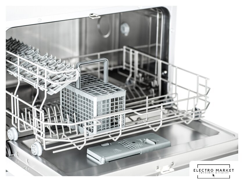 загрузка на 6 комплектов посуды, сенсорное управление, 4 программы, 56x50x46.5 см, белый цвет, сушка: стандартная (конденсация), индикация на полу: нет