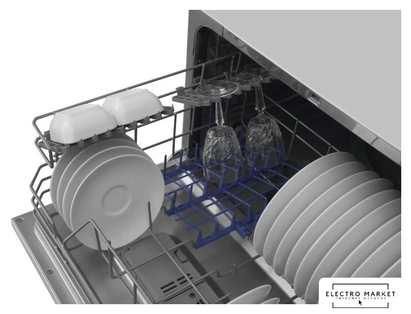 загрузка на 6 комплектов посуды, сенсорное управление, 4 программы, 56x50x46.5 см, белый цвет, сушка: стандартная (конденсация), индикация на полу: нет