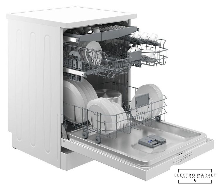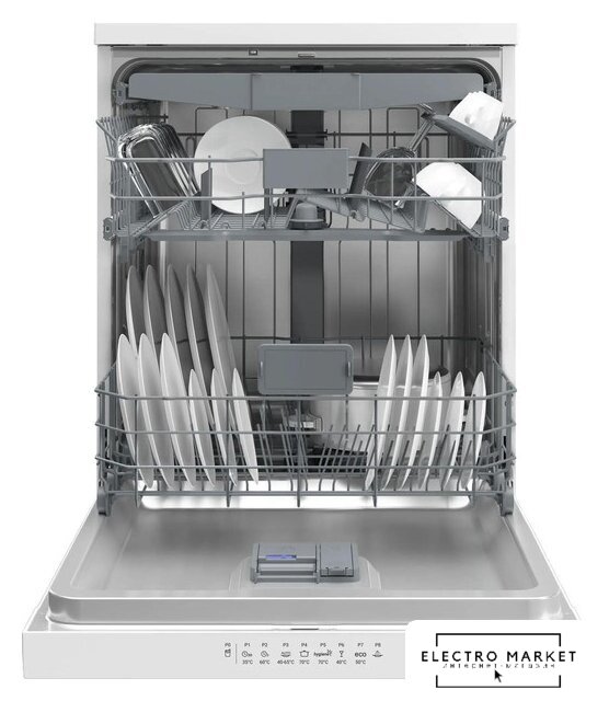 загрузка на 13 комплектов посуды, электронное управление, 8 программ, белый цвет, сушка: с открыванием дверцы, индикация на полу: нет