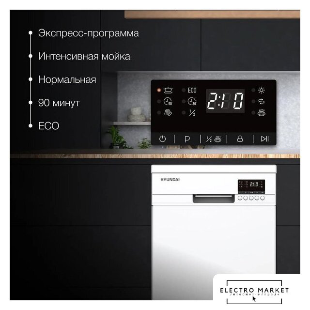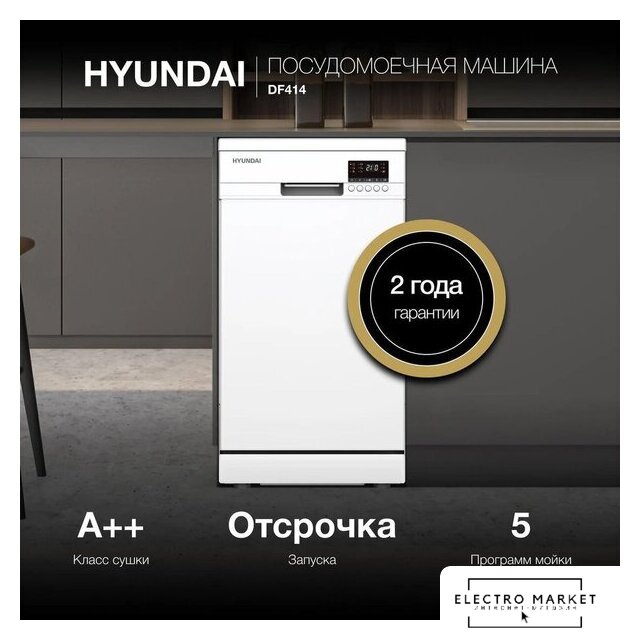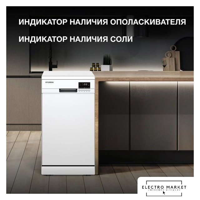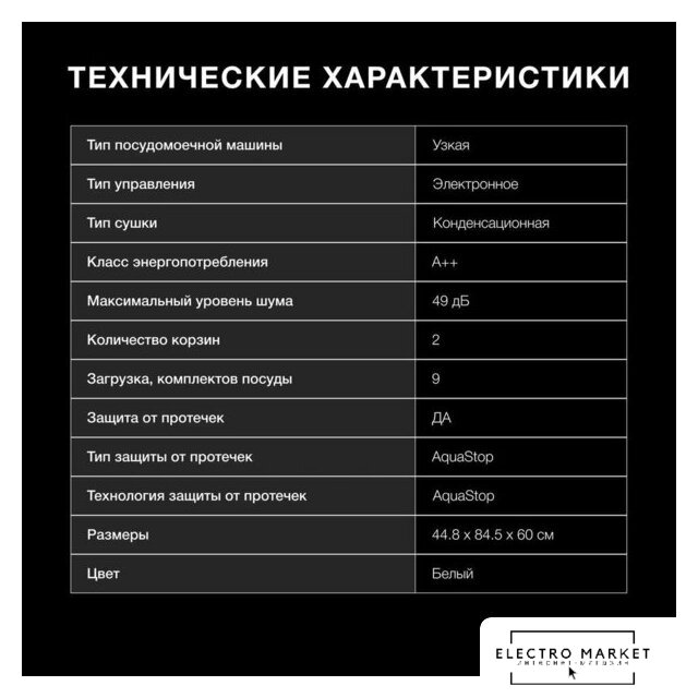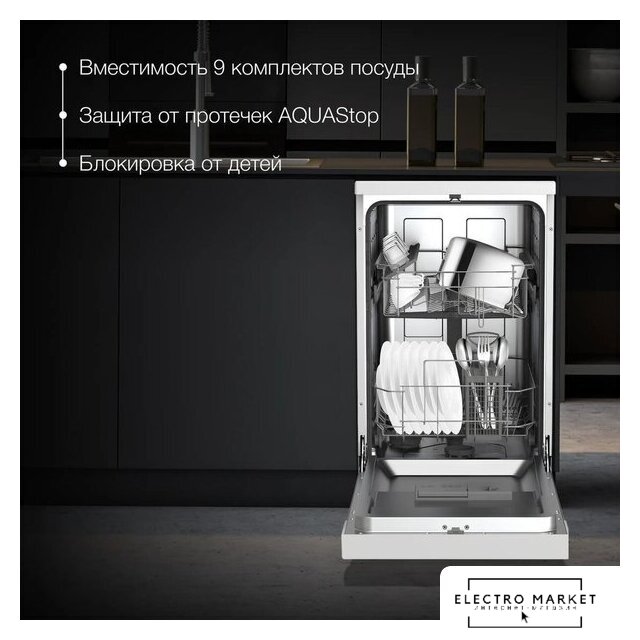 загрузка на 9 комплектов посуды, электронное управление, 6 программ, белый цвет, сушка: стандартная (конденсация), индикация на полу: нет